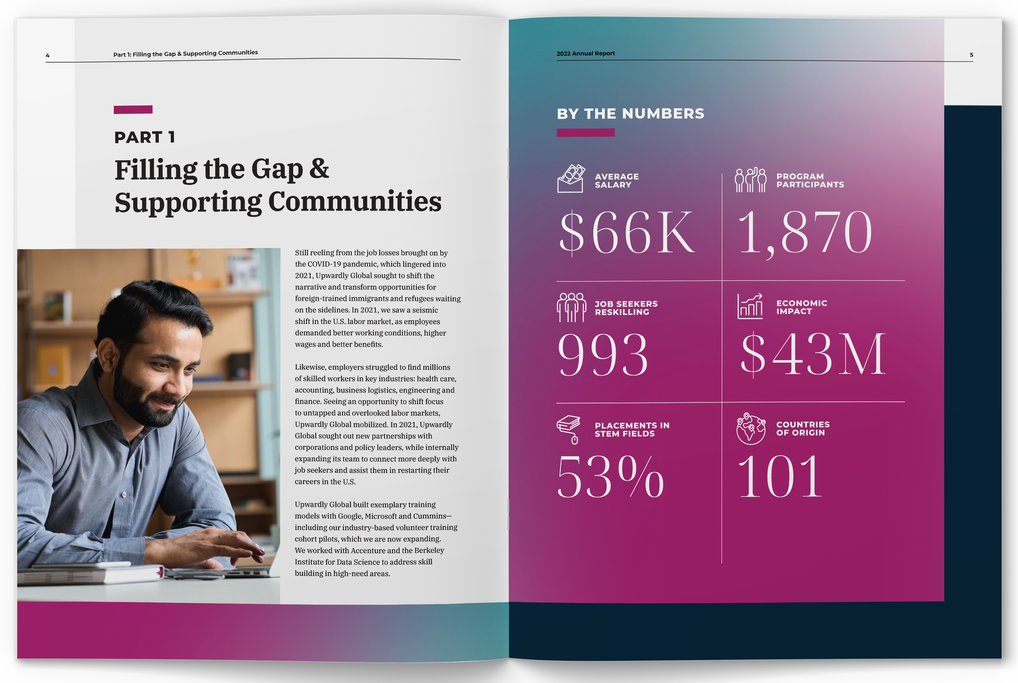 Upwardly Global is a non-profit organization that helps immigrant, refugee, and asylum-seeking professionals rebuild their careers in the United States. Its mission is to eliminate employment barriers for skilled immigrants and refugees, and integrate this population into the professional U.S. workforce. This year’s report documented Upwardly Global’s achievements, including rapid response to incoming Afghani refugees. The design approach employed a system of overlapping color blocks, which depict the way these disparate career-seeking stories come together to form the narrative arc.